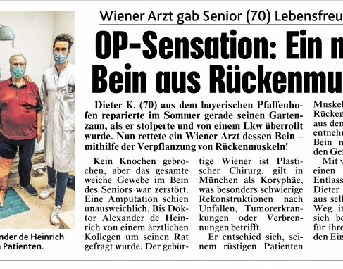 AdH im Münchner Merkur: ein Bericht über einen außergewöhnlichen rekonstruktiven Eingriff, bei dem einem 70-jährigen Patienten durch die Verpflanzung von Rückenmuskulatur ein neues Bein ermöglicht wurde. Der Beitrag zeigt plastische Chirurgie dort, wo sie nicht ästhetisch, sondern existenziell wird: als Wiederherstellung von Funktion, Stabilität und Lebensqualität.